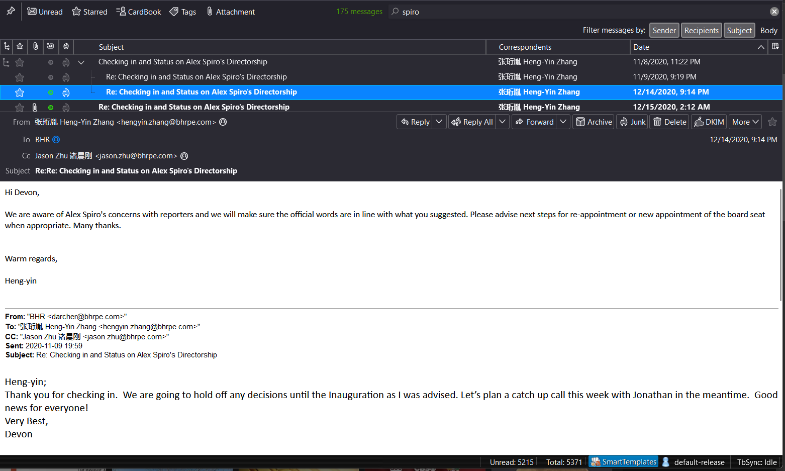 Emails show that Archer and Zhang were still discussing the search for a replacement for Spiro a full year later in December of 2021.