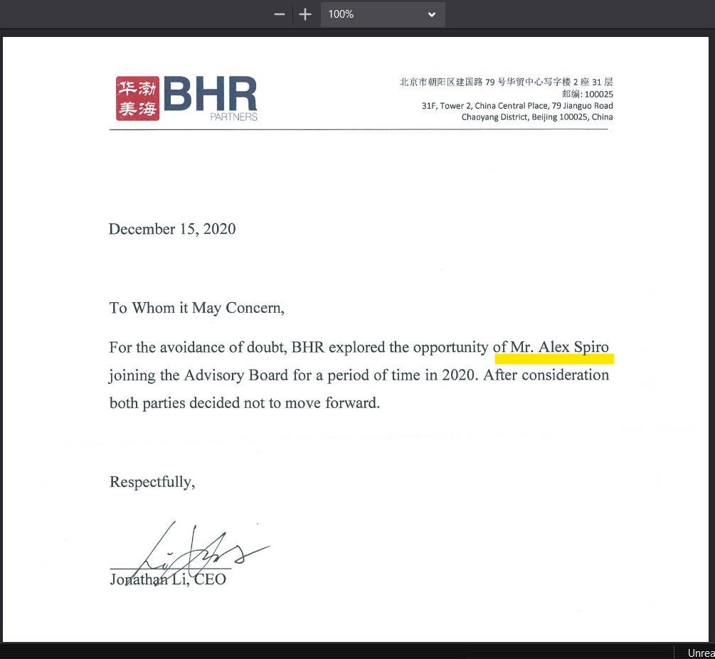 “For the avoidance of doubt, BHR explored the opportunity of Mr. Alex Spiro joining the Advisory Board for a period of time in 2020. After consideration both parties decided not to move forward.”