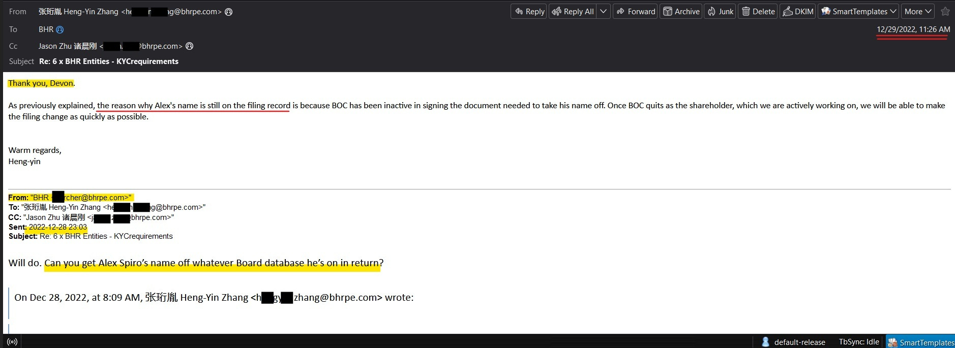 It appears no action had been made in all of 2022 to remove Spiro's name from the filing record as director. Apparently, the prolonged delay was due to BHR's largest and most powerful shareholder - the Bank of China.