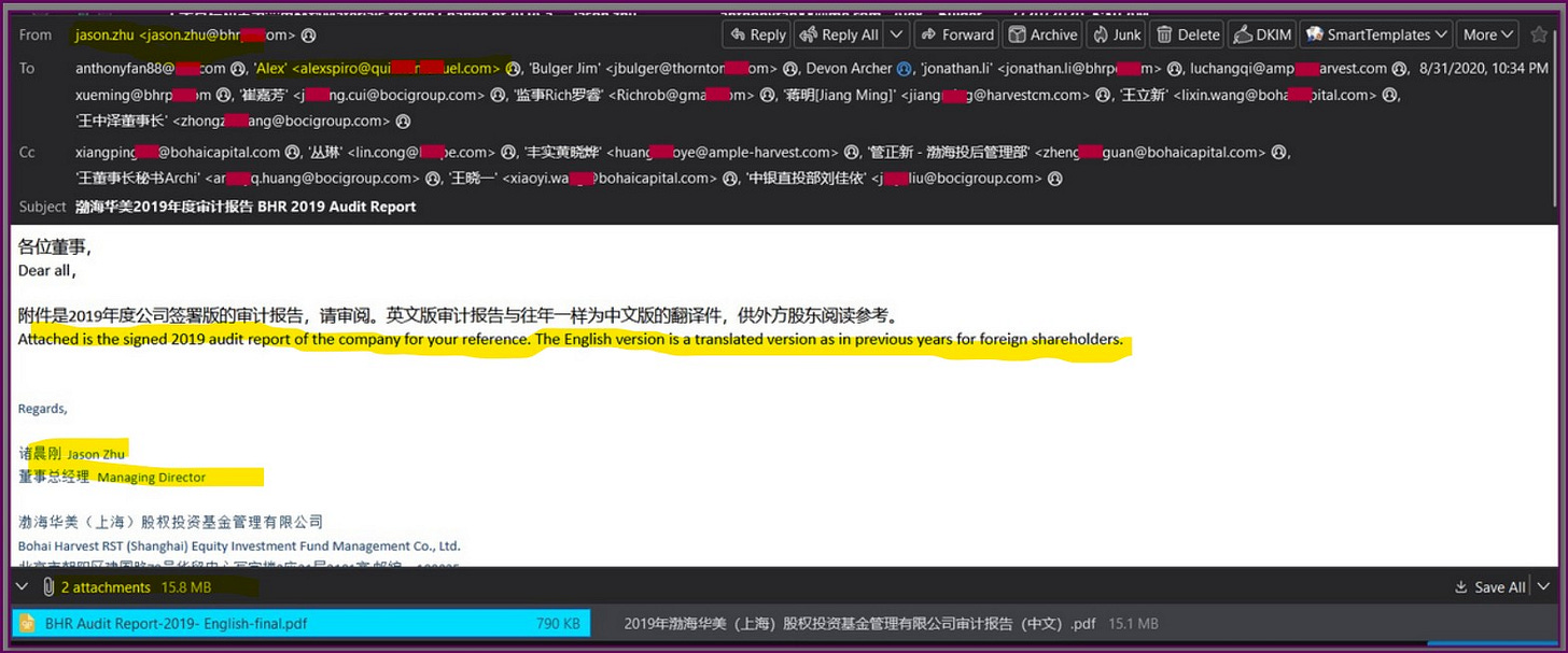 In an email dated 31st August 2020,(just one of more than 60K, sourced via a whistleblower) the Managing Director of BHR, Jason Zhu, sent an email to the Board Members of the company, titled "BHR 2019 Audit Report".