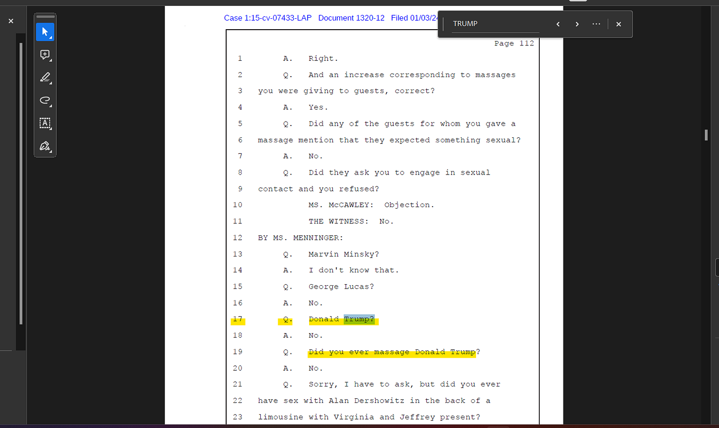 “Did you ever see Donald Trump at Jeffrey’s (Epstein’s) home?”