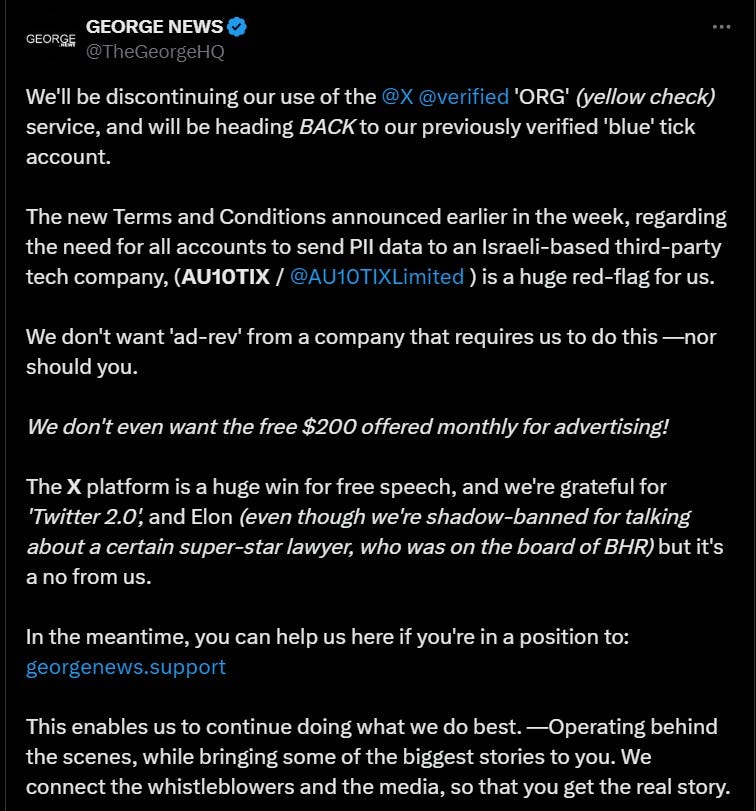 UPDATE: 6 hours after this publication was sent out, we have been informed by Chris Stanley (a great guy) at X, that X will be rolling out an additional option for ID verification, via STRIPE —the payment company already in use by X to process AdRev bi-monthly payments. ps subscribe to Chris on X here.