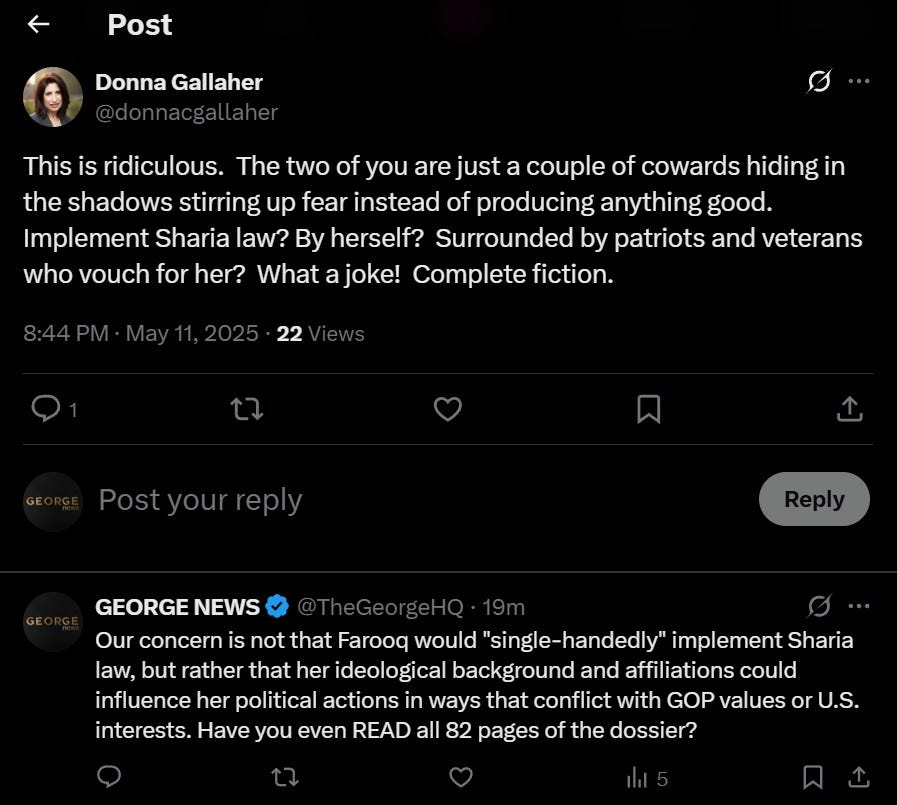 Lack of Specific Rebuttal: The critic does not directly address our claims, such as Farooq’s employment history, her family’s ties to Jamaat-e-Islami, or her connections to global financial networks. (The only specific counterpoint we could find is the dismissal of the idea that Farooq could implement Sharia law, which is framed as an exaggerated and mocking rebuttal rather than a reasoned response, by Donna Gallaher)