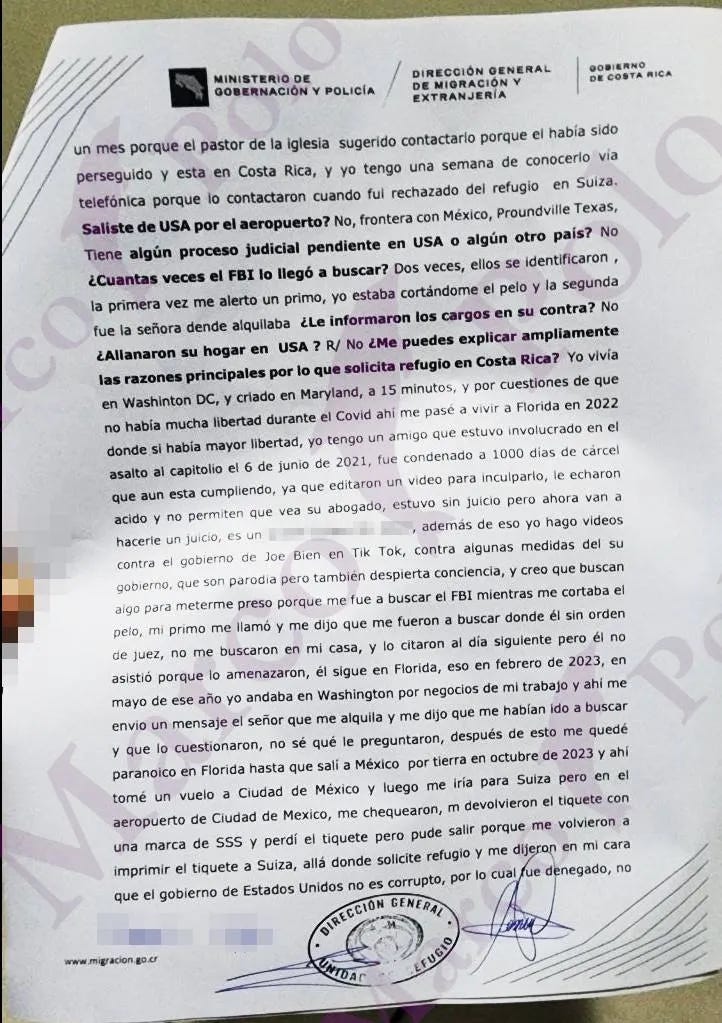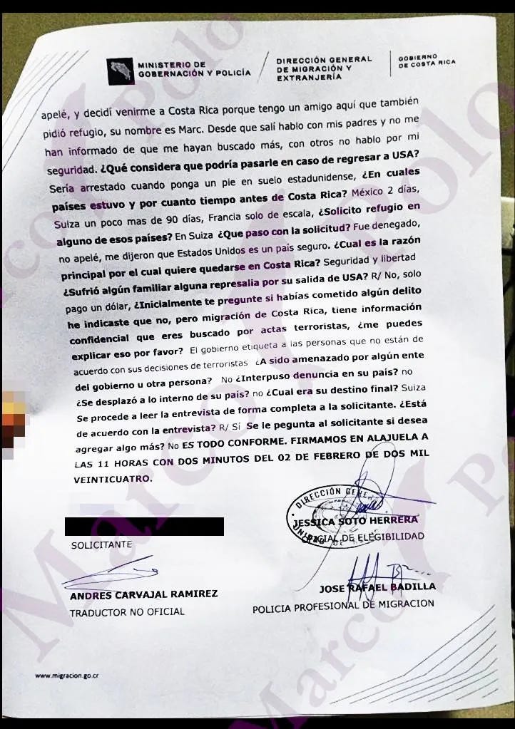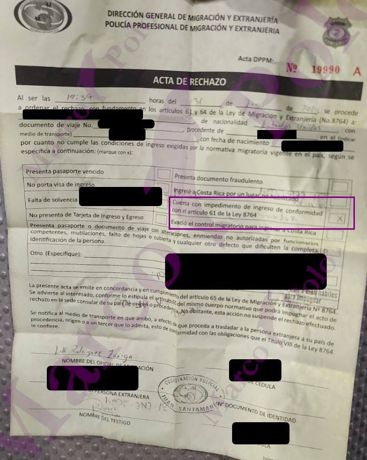 "Costa Rica immigration has confidential information that you are wanted for terrorist acts"