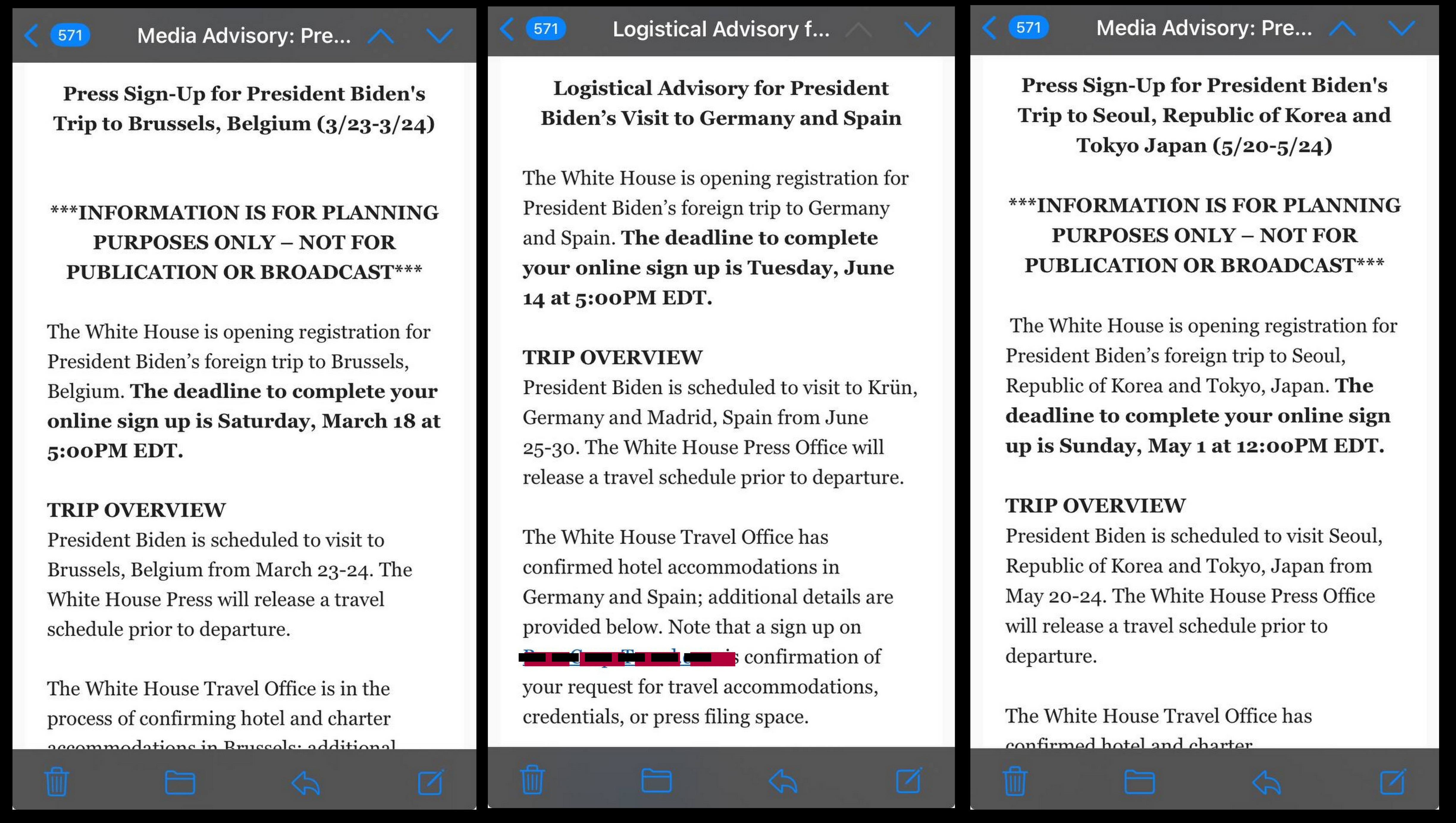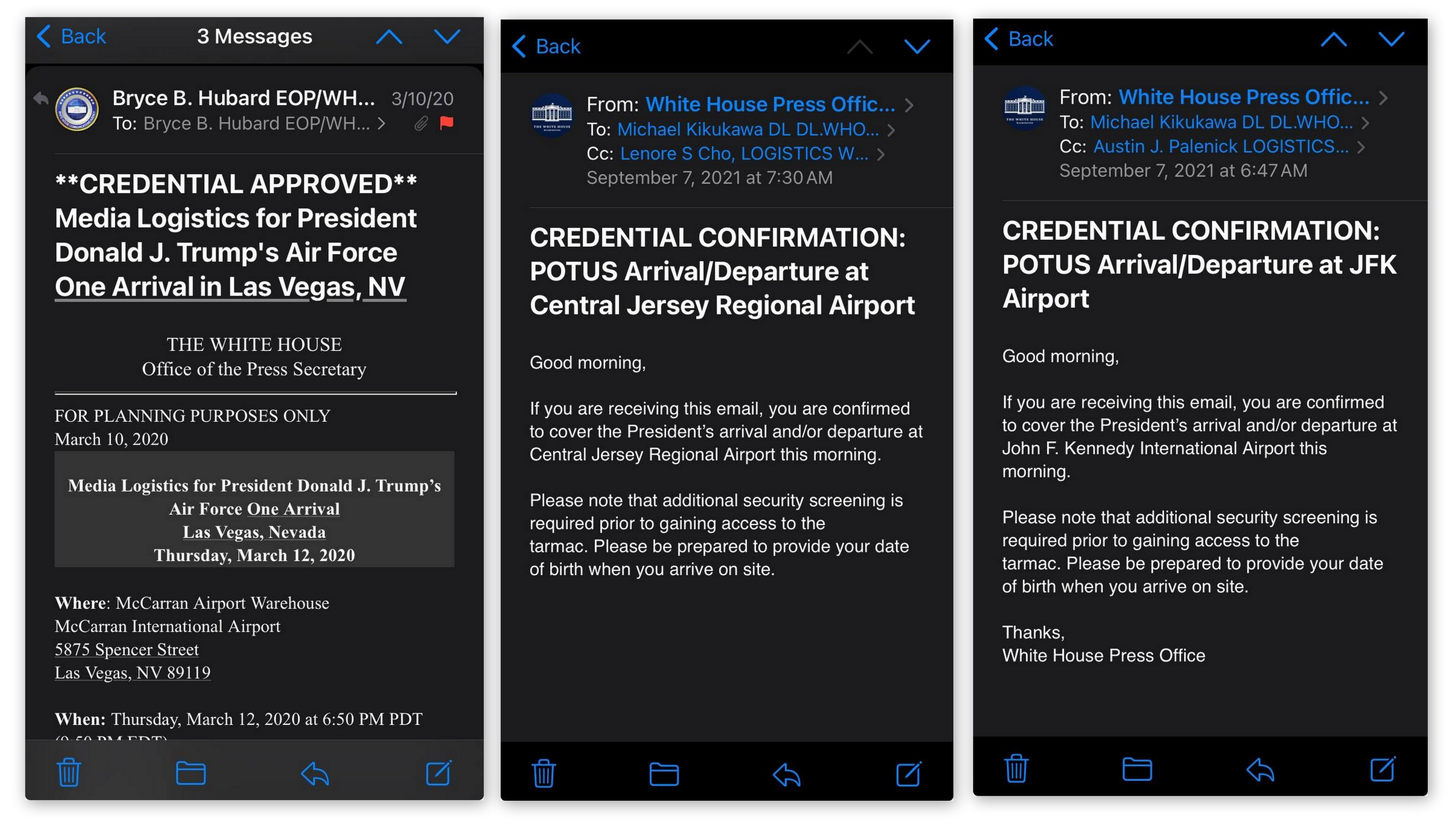 Examples of email confirmations, for previously requested media events involving POTUS: “**CREDENTIAL APPROVED**”.