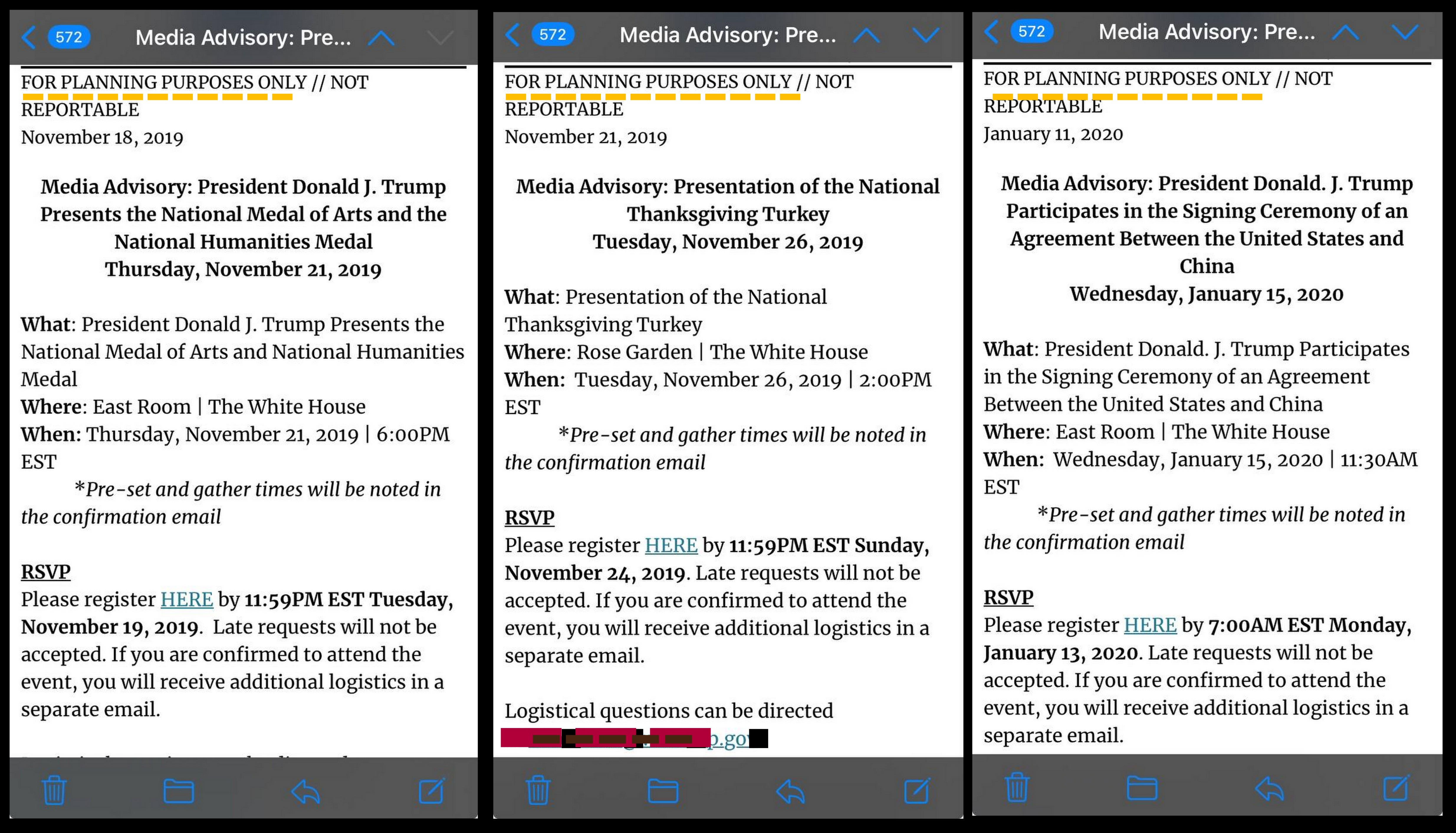 When the White House plans an event for POTUS or VPOTUS, which pre-credential media will attend, an email is sent out to a small group list, held by the WHCA (White House Correspondent's Association) and the White House Press Office. The media is then invited to request ‘credentials’ for that event.