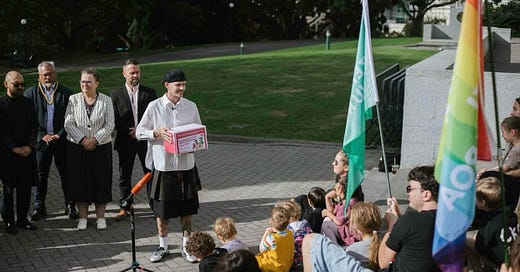 The LGBTQ+ activist, Benjamin Cody Doyle (who also uses a fake indigenous name of “KAURI”, instead of “CODY at Waikato University) is the New Zealand Greens spokesperson for early childhood development. He is seen here on the steps of New Zealand parliament, with young children, some of whom appear to be wearing ‘rainbow / pride’ colors. *The children have the consent of parents and guardians to be photographed, according to The Green Party Instagram account.