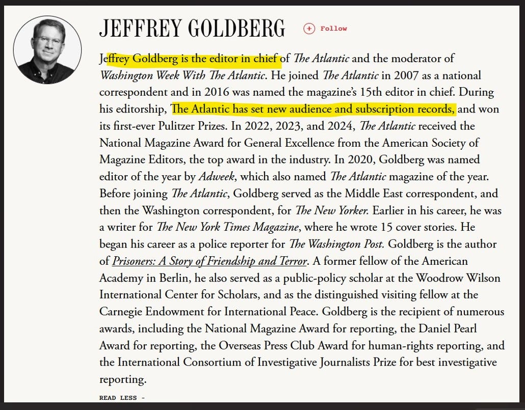 What’s concerning here, is that both, Jeffrey Goldberg, and his CEO, Nick Thompson, both laud the company’s great subscriber list and its growth.
