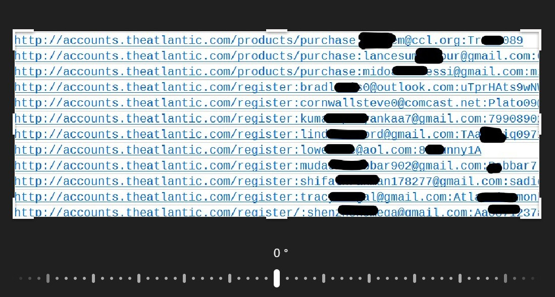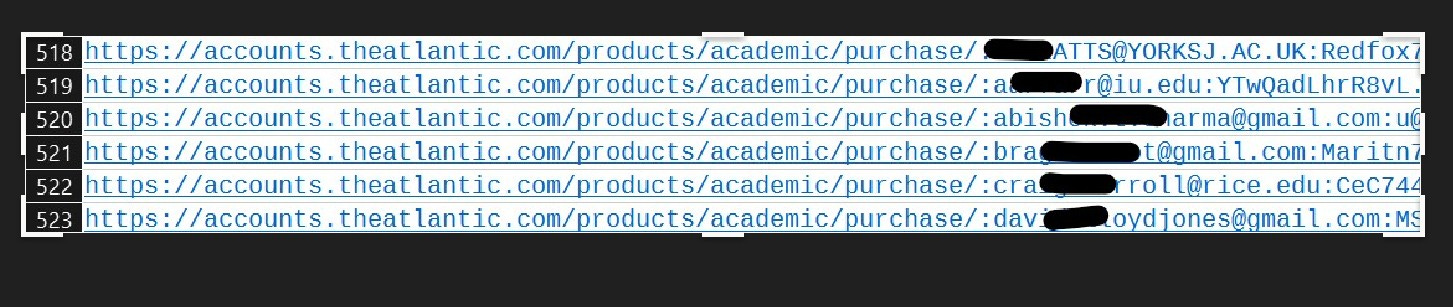 On Tuesday, 25th of March, 2025, we were able to view thousands of records that appear to have be saved, when readers of The Atlantic, either signed up, made a purchase, or redeemed a free trial. There are also hundreds of records on hand, for those that 'forgot a password', or requested a new password.