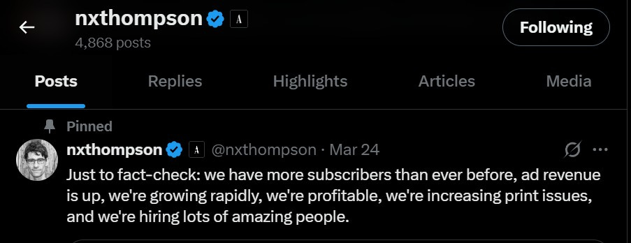 “Just to fact-check: we have more subscribers than ever before, ad revenue is up, we’re growing rapidly, we’re profitable, we’re increasing print issues, and we’re hiring lots of amazing people”