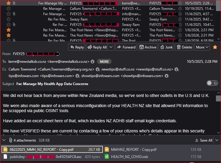By October 5, 2025, FVEY25 escalated to Newstalk ZB again, attaching an Excel sheet exposing a separate Health NZ misconfiguration leaking ADHB staff credentials.