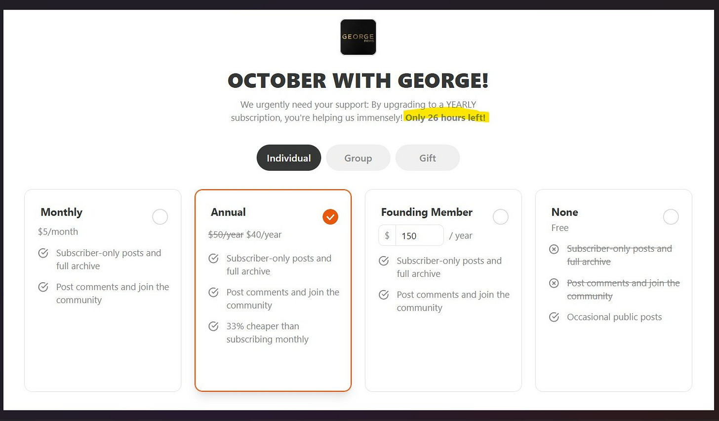 If you’d like to join them and help keep independent journalism alive, you can upgrade at 20% off HERE, or make a one-off donation.