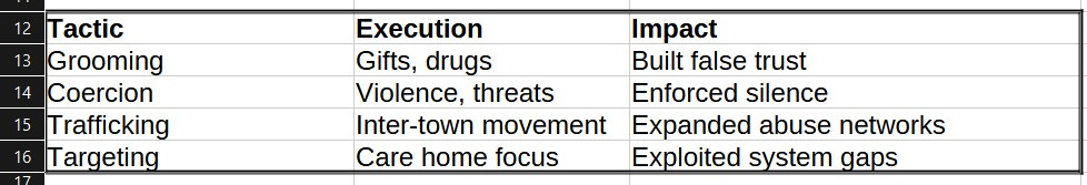 Grooming: Perpetrators, often in roles like taxi drivers or takeaway workers, lured girls with gifts, drugs, or affection. A Rochdale victim described being given vodka before abuse began (The Week, 2023).