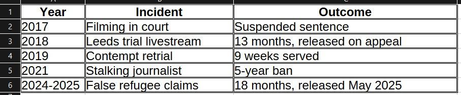 2018: Jailed for 13 months after livestreaming outside a Leeds grooming trial, nearly derailing it. He was then released on appeal after serving two months.
