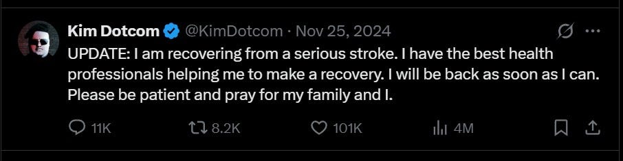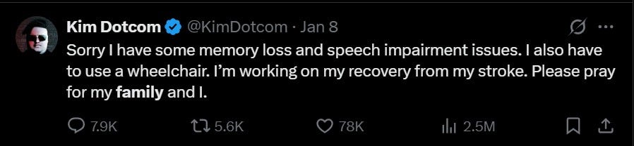 As of June 27, 2025, Kim Dotcom is recovering from a severe stroke suffered in November 2024, which has left him with memory loss, speech impairment, and wheelchair use (NZ Herald). An extradition order was signed in August 2024, but he remains in New Zealand, fighting the case (RNZ News). His health condition makes extradition potentially inhumane, adding a humanitarian argument for dismissal.